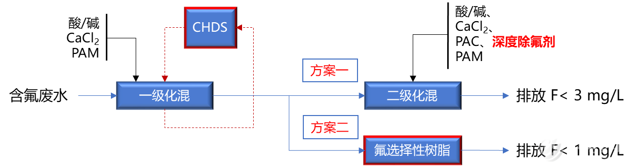 Key technologies:The high density sludge (PCR-CHDS) method, advanced fluorine removal agent and fluorine selective resin